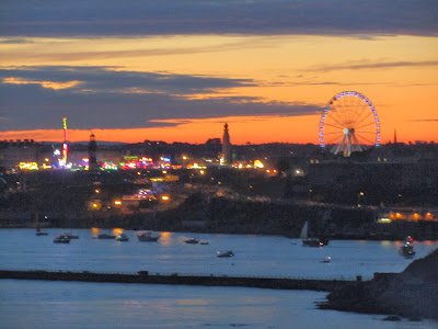 The sea is liquid plastic. Yachts are cornflake packet models. A ferry hugs the coast, shy of entering port. The distant coastline glitters with fairground lights beneath the orange-striped horizon.